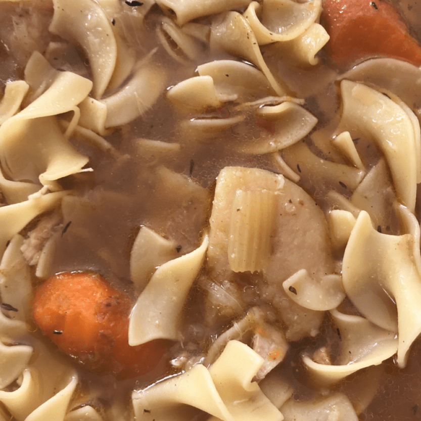 Heat butter sauté garlic salt pepper onions potatoes carrots and celery Then throw in the raw chicken cut in pieces. Brown just a little bit ( approximately 5 minutes) add water and boil till the liquid is reduced by 1/2 Then you add celery salt and mushroom powder and throw in the noodles and let them cook till tender. I used egg noodles and they cook really fast. Serve w crusty bread.