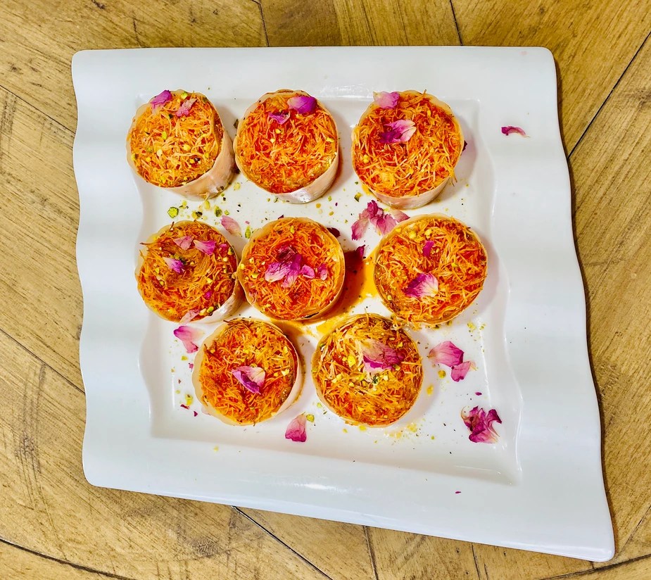 Mix in your melted butter and food color and mix well and make sure all the phyllo has butter and is orange.